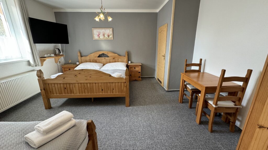 Tento odhlučněný třílůžkový pokoj má výhled do zahrady a posezení.